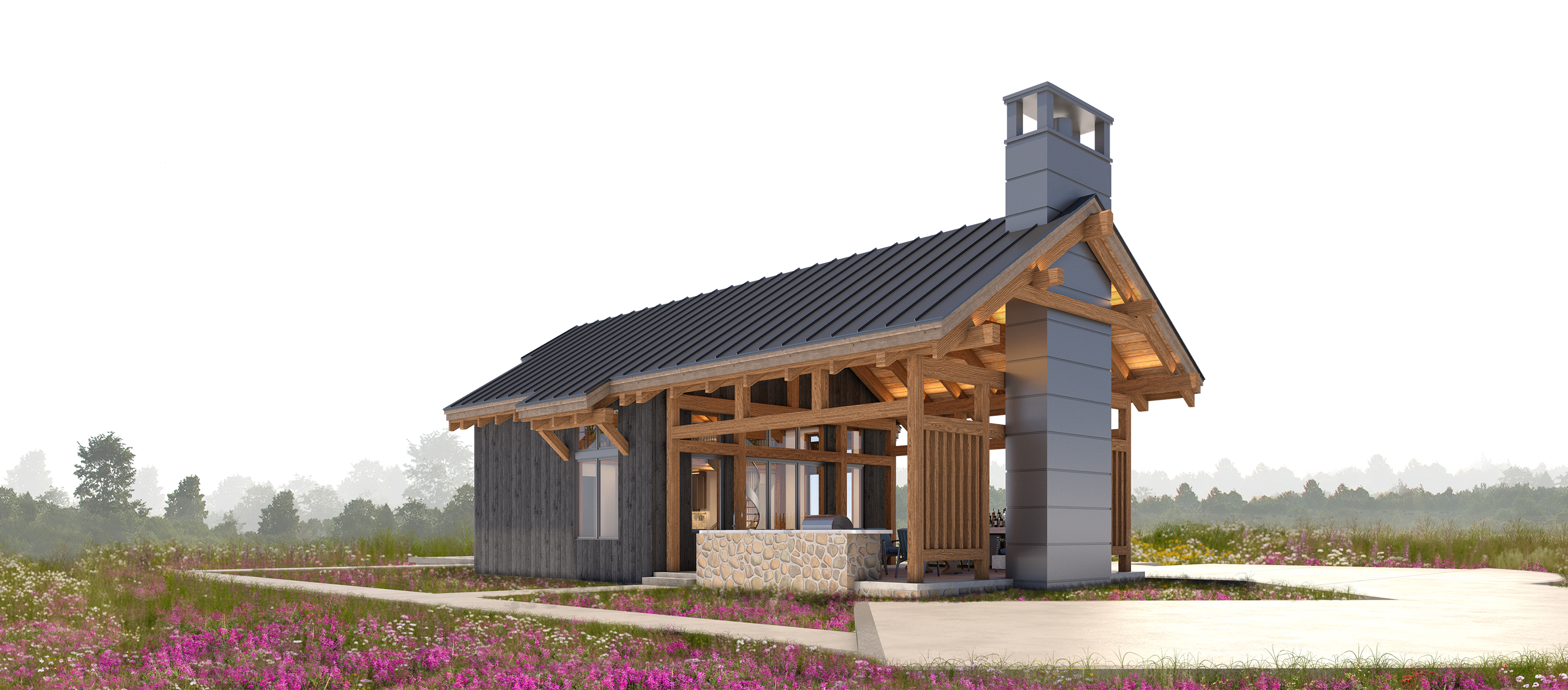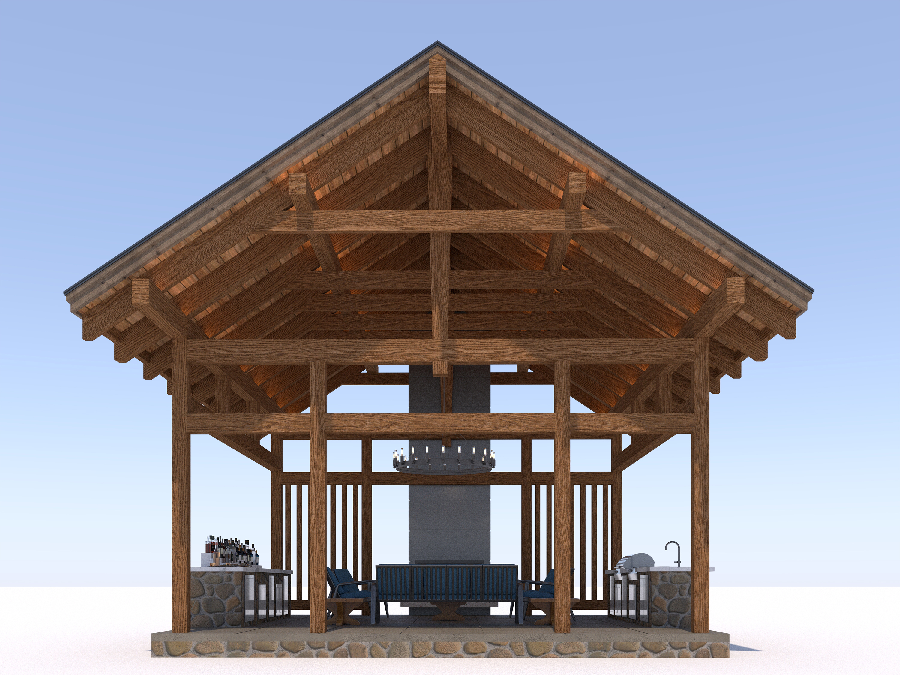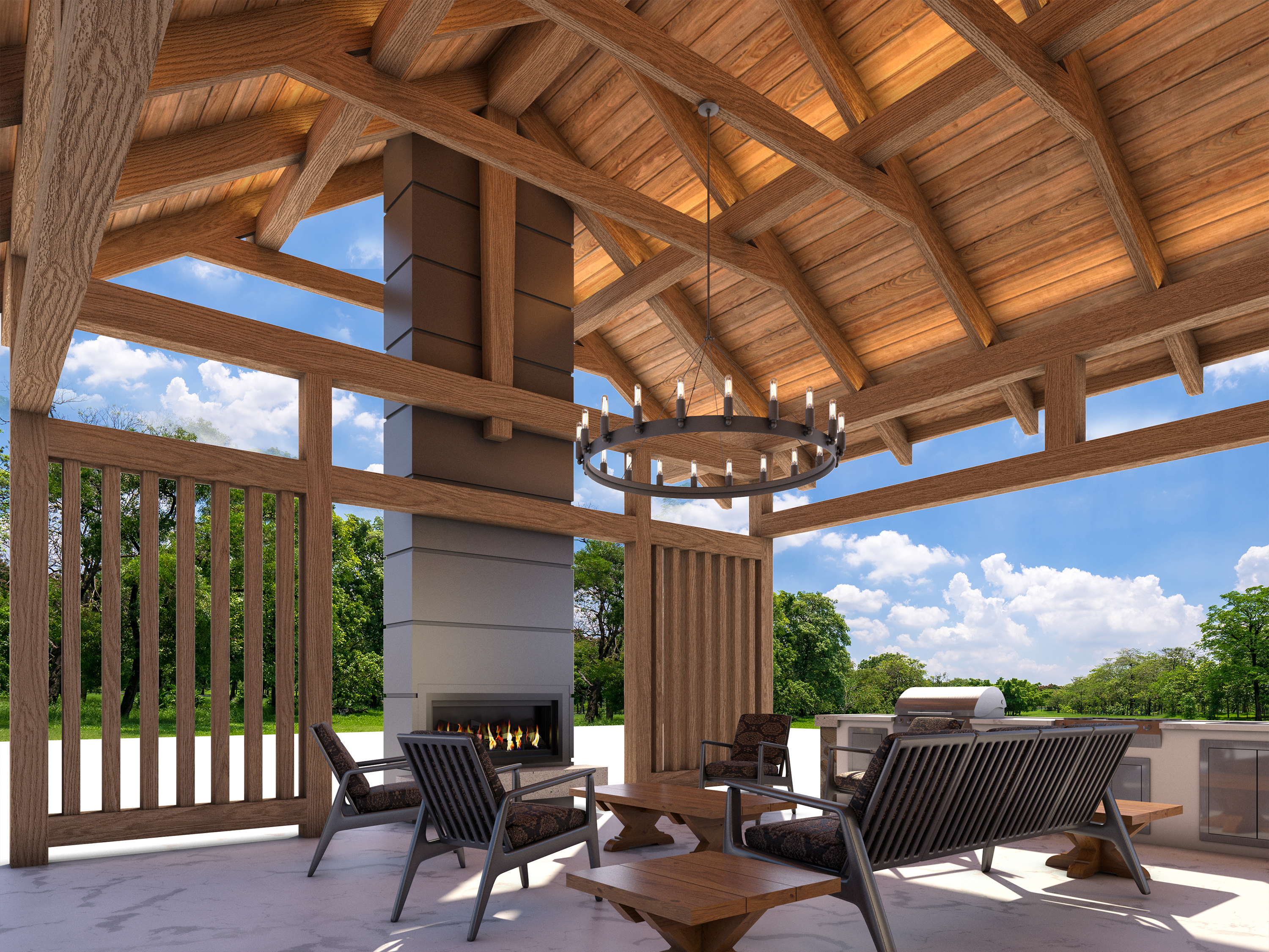 The outdoor option allows you to bring the timelessness of the timber framing into your finished home. At roughly 650 sq ft, this is the perfect gathering space for all your outdoor needs. Providing an outdoor cooking area and fireplace, the larger timber-framed pavilion offers a meaningful space to foster connections for your family. The rustic pavilion offers a warm and welcoming outdoor environment for building your connections