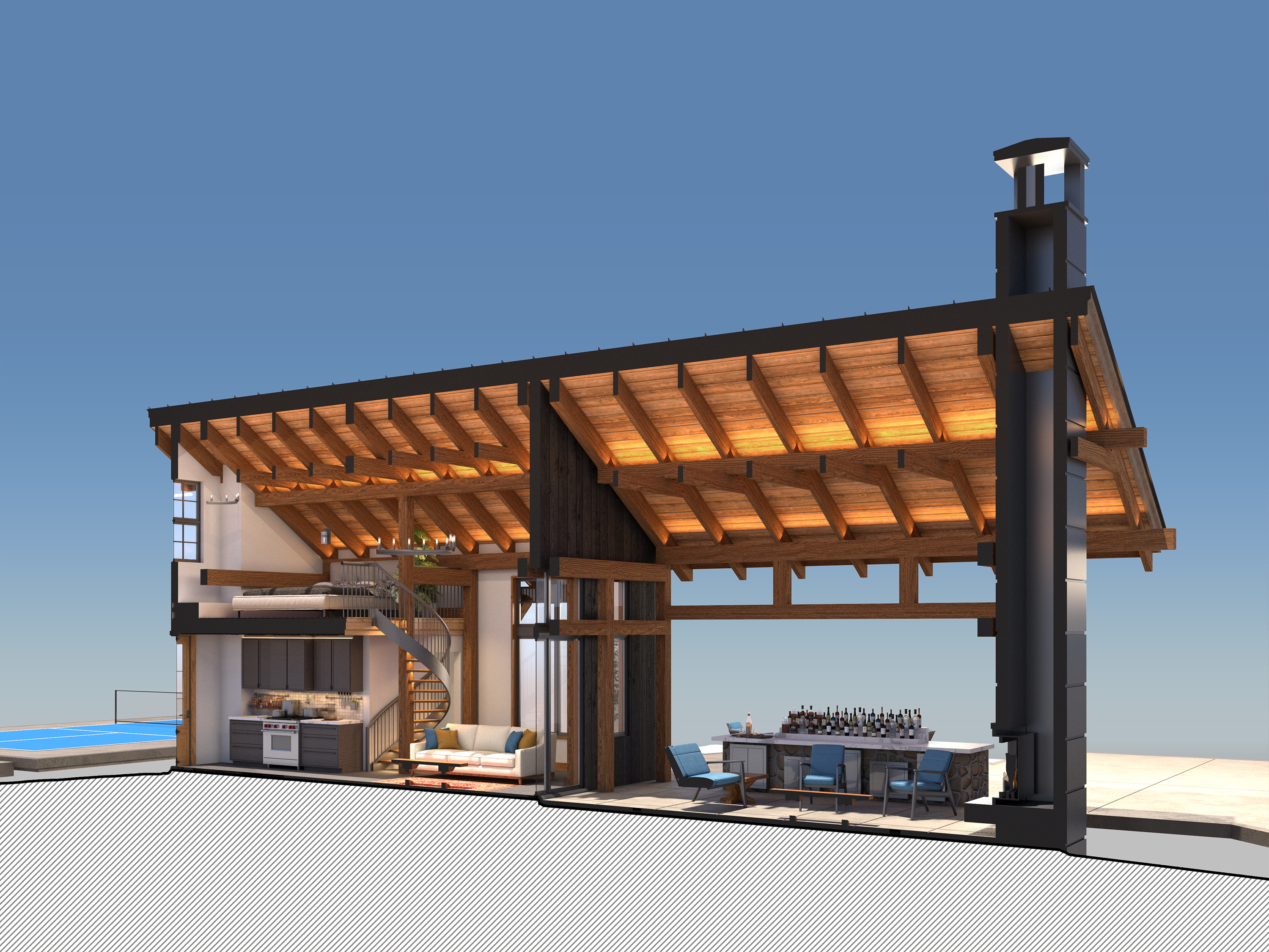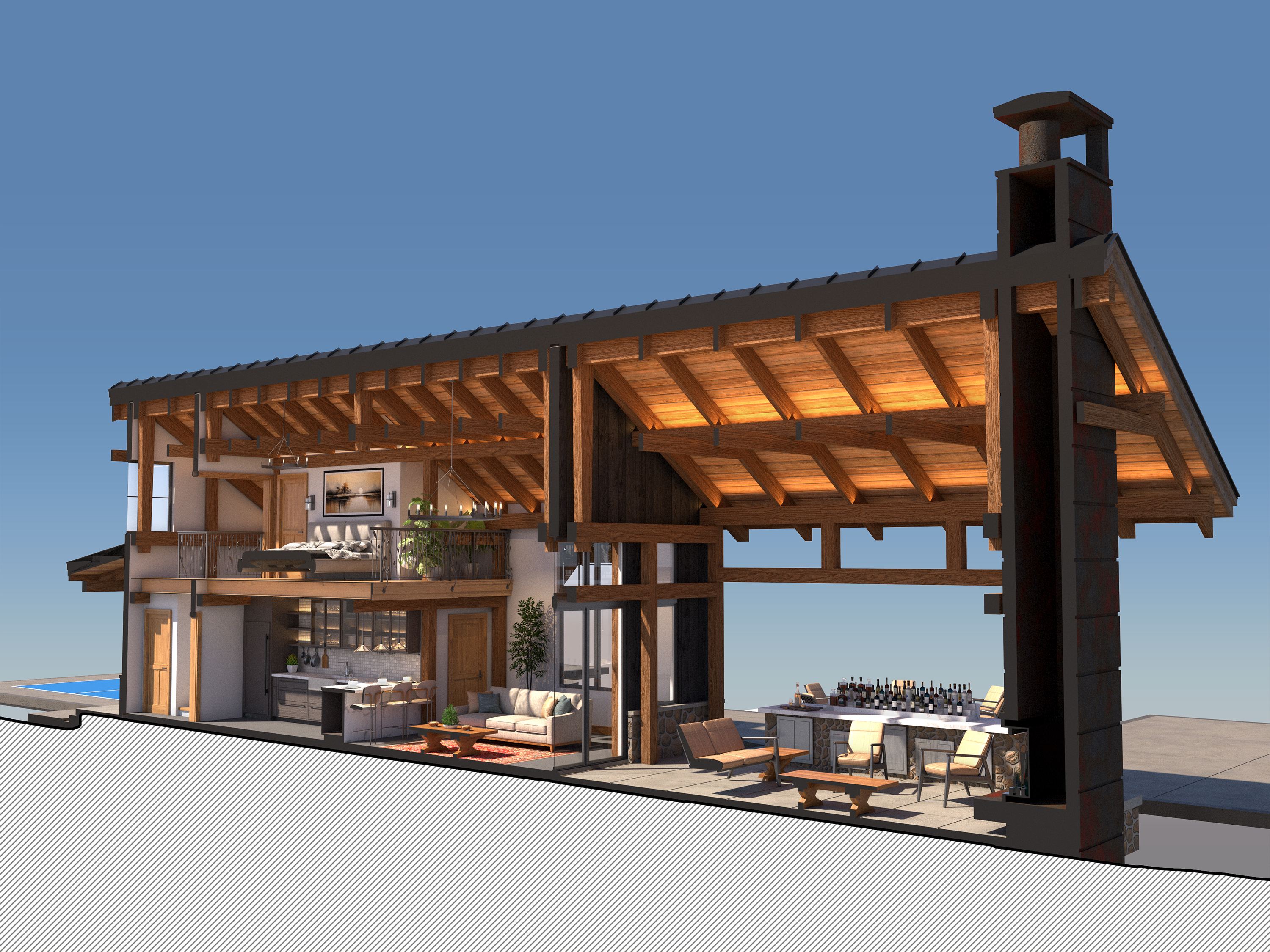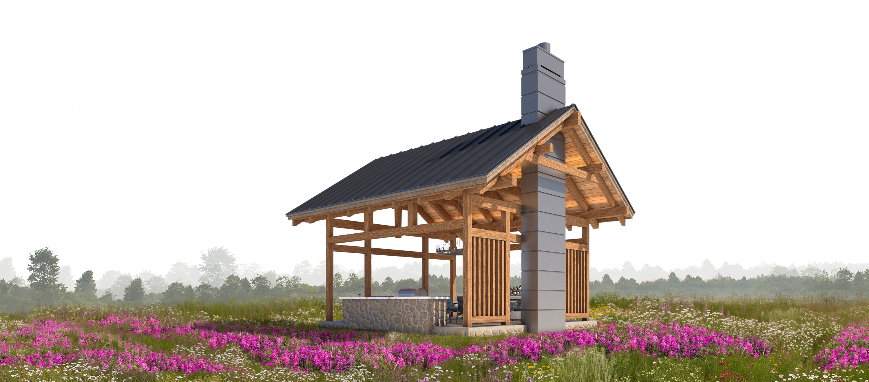 The outdoor option allows you to bring the timelessness of the timber framing into your finished home. At roughly 650 sq ft, this is the perfect gathering space for all your outdoor needs. Providing an outdoor cooking area and fireplace, the larger timber-framed pavilion offers a meaningful space to foster connections for your family. The rustic pavilion offers a warm and welcoming outdoor environment for building your connections