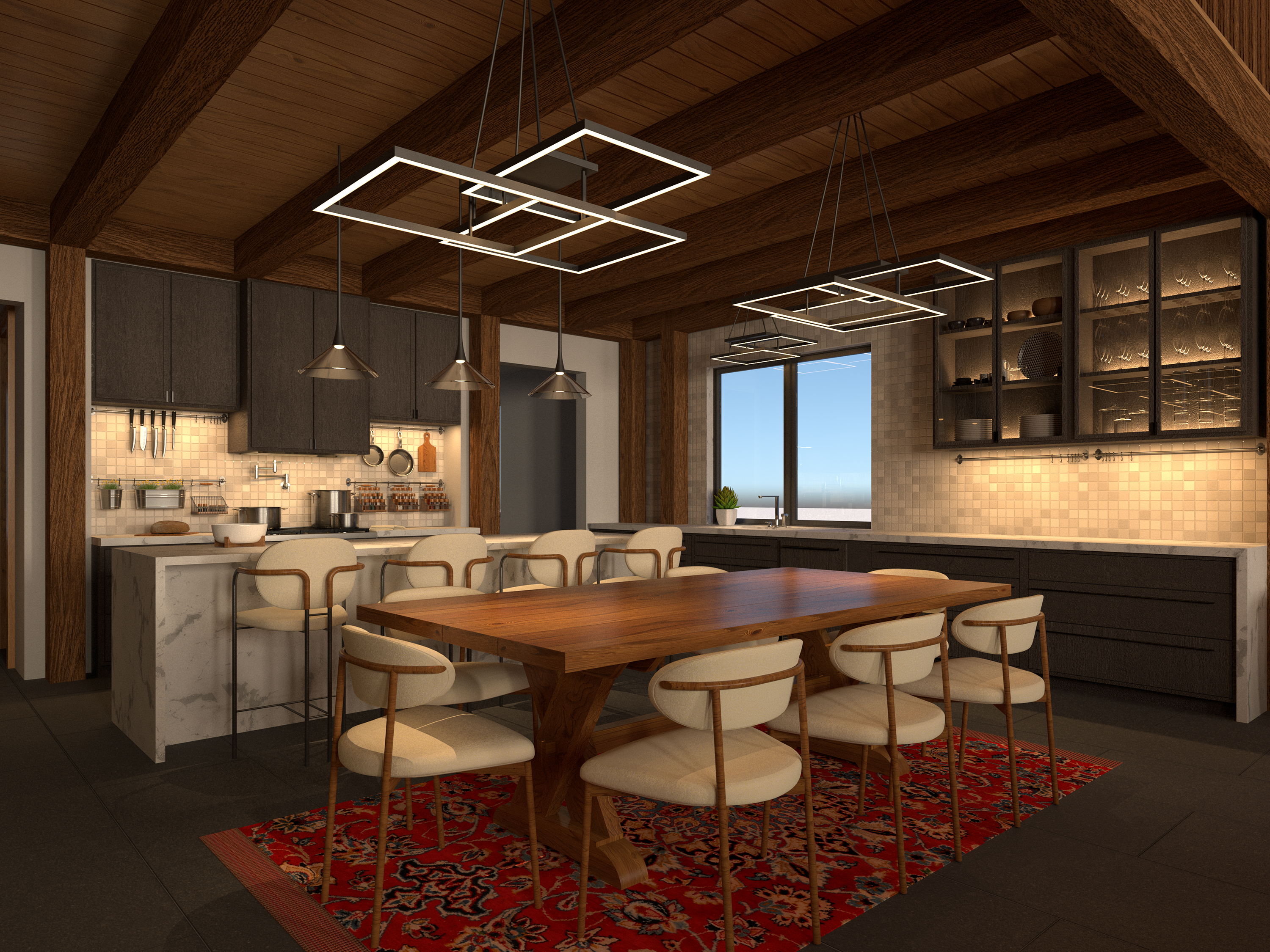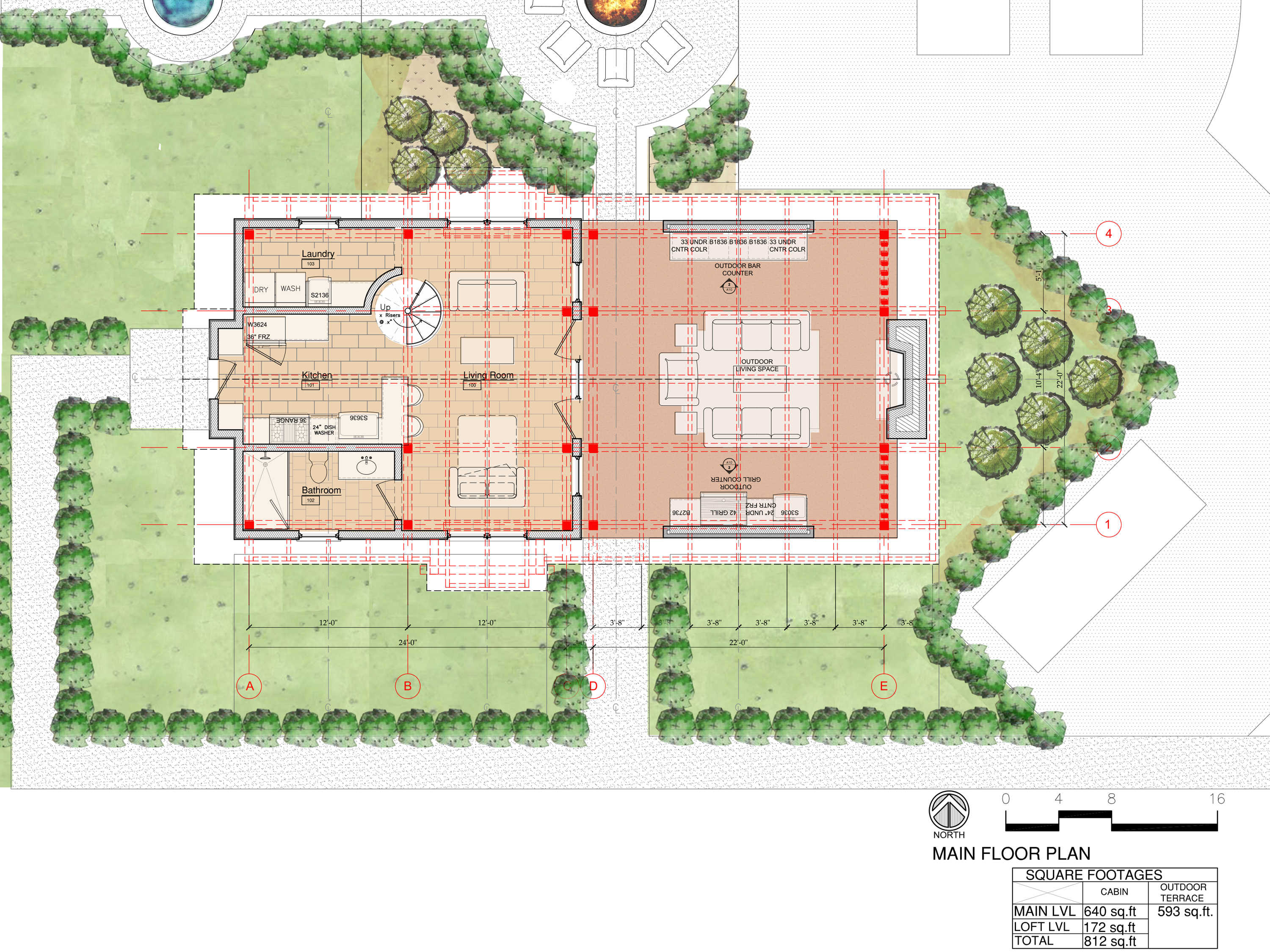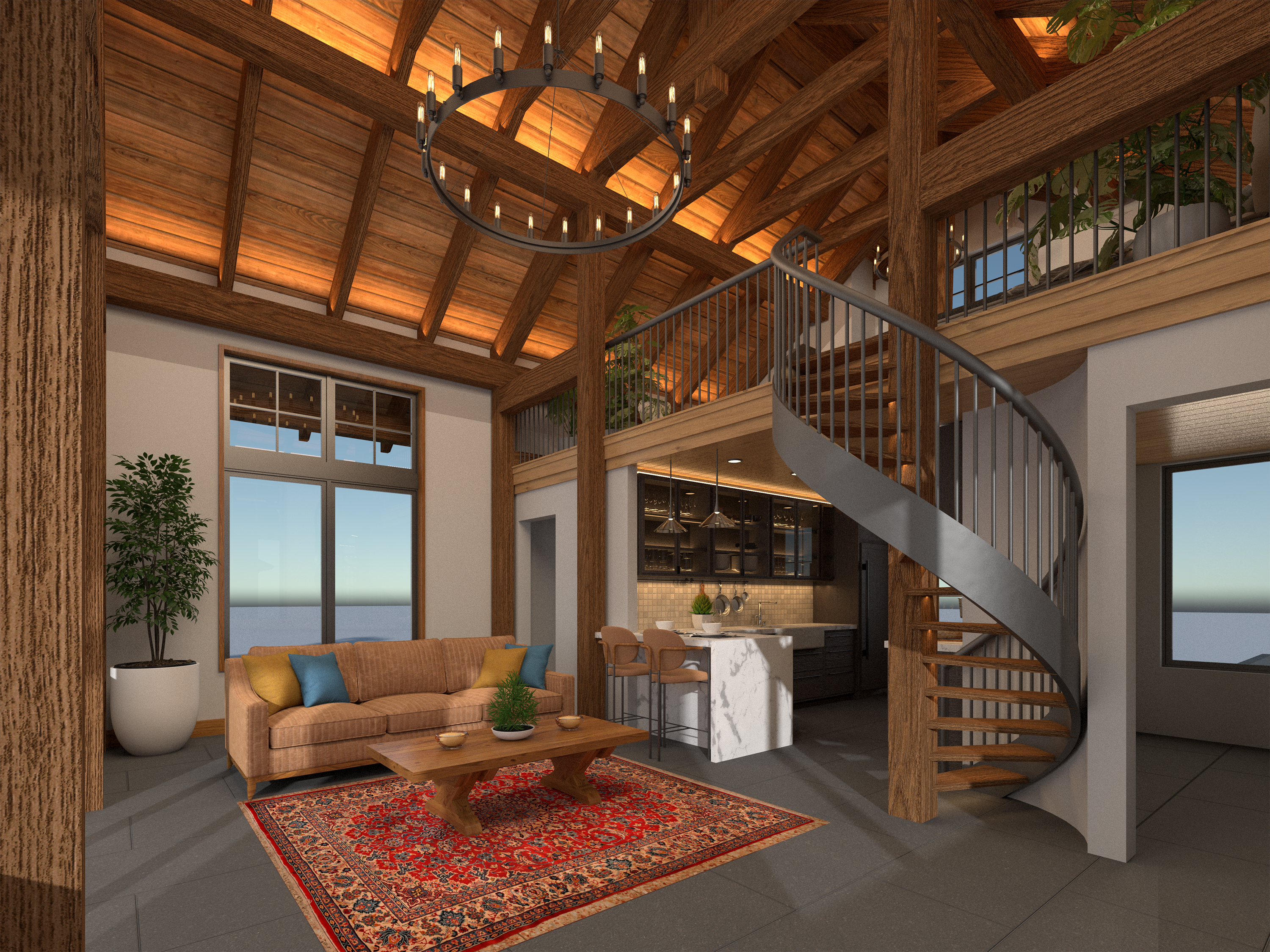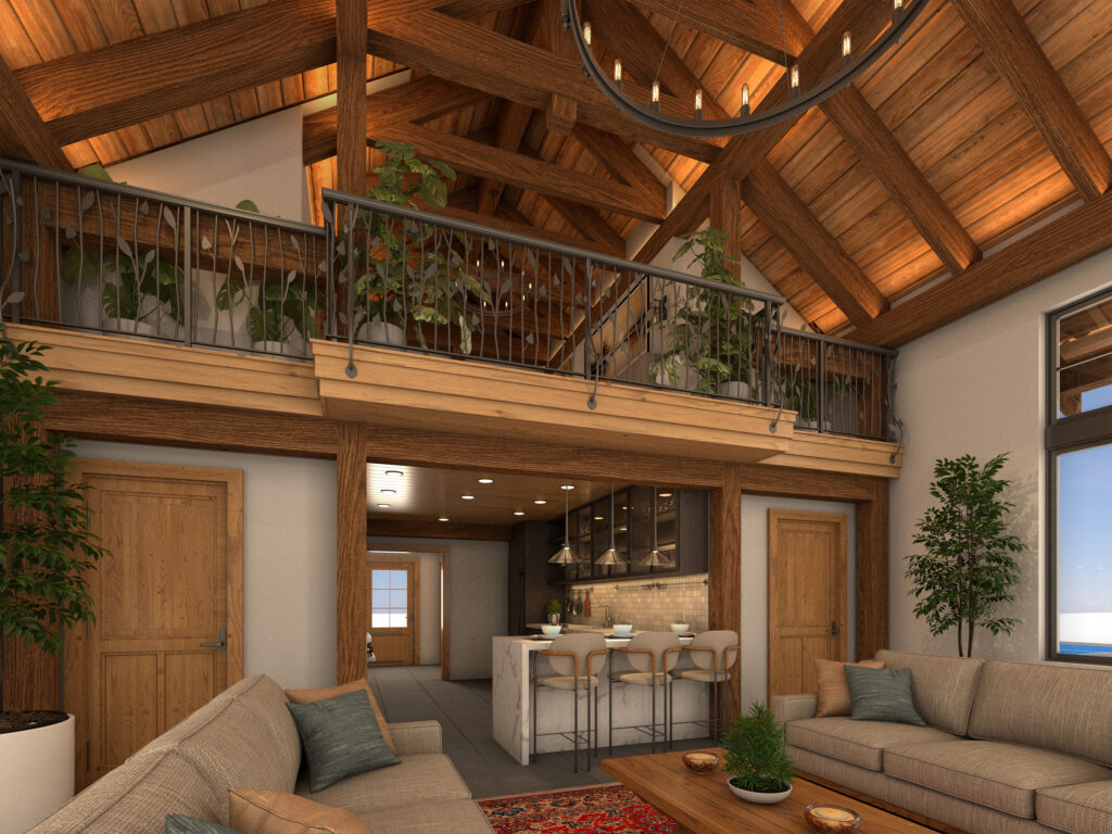 This is the smallest living option with 1-bed 1-bath, measuring at 812 sq ft. This option is the perfect connection to the outdoors, emphasizing deep personal connections through meaningfully designed interiors with an abundance of natural light. Featuring a thoughtfully condensed kitchen and a spiral staircase leading to the bedroom loft, this is the perfect space for couples or outdoor retreats. This option blends practicality with the rustic charm and modern feel of the previous options, creating an intimate and nurturing design.